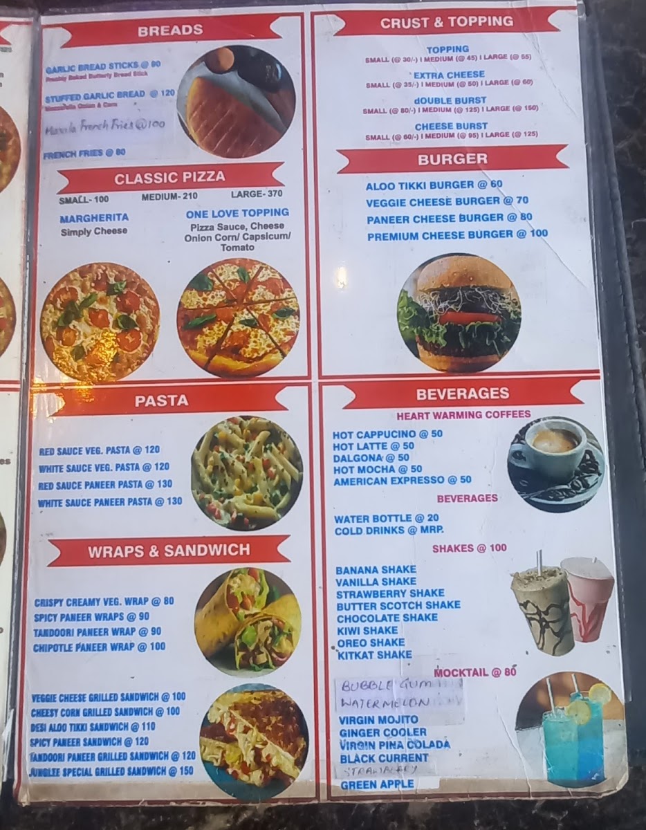 Junglee Beans Cafe offers a menu that caters to both traditional and adventurous palates. One cannot miss the Classic Margherita Pizza, an iconic representation of perfect simplicity with its fresh basil and mozzarella. For those craving something with a bit more flair, their newcomers like the Mediterranean, Gourmet Hill, Veg. Extravanza, and Veg. Supremo pizzas promise to tantalize your taste buds. Pair your meal with a refreshing Virgin Mojito or a cool Ginger Cooler — the perfect choice to beat the heat!